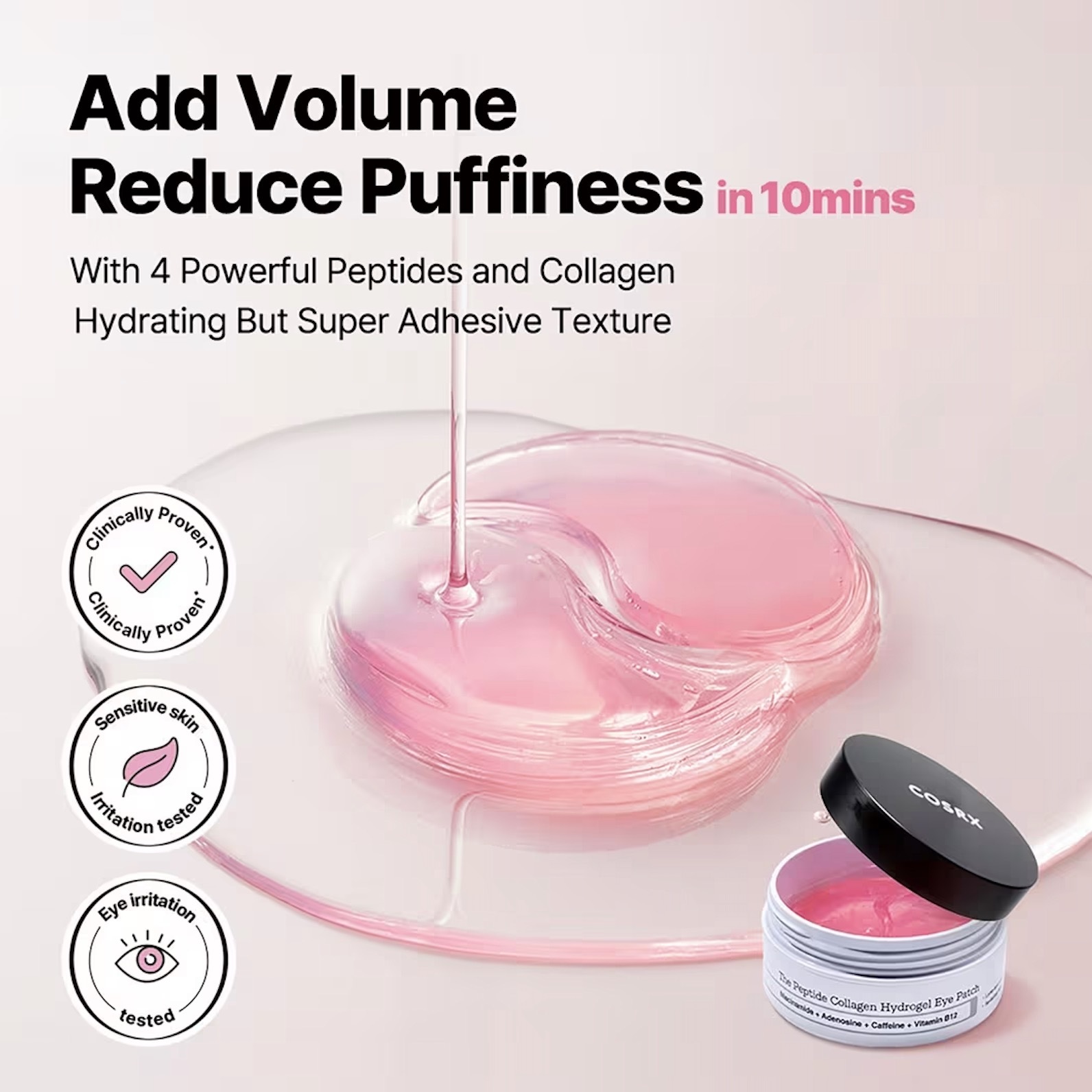 Introducing The Peptide Collagen Hydrogel Eye Patch from COSRX: a targeted eye mask designed to reduce puffiness and diminish the look of dark circles. Enriched with peptides, it helps combat the signs of aging by smoothing fine lines and wrinkles, leaving the under-eye area refreshed.