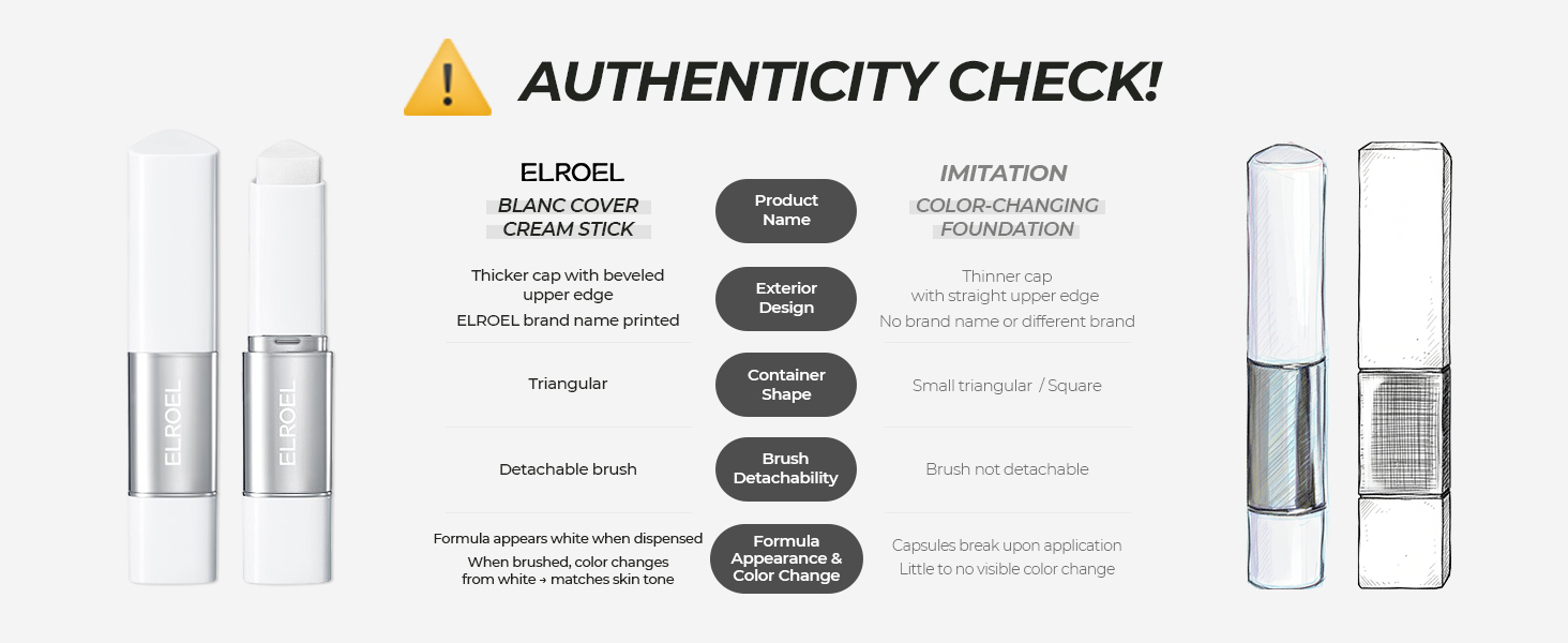 COLOR-CHANGING STICK FOUNDATION. Meet your new beauty essential — the ELROEL Blanc Cover Stick V! This innovative color- changing makeup stick starts as a soft white balm and transforms into a silky, tinted cream that blends seamlessly into your skin. With each stroke of the built-in brush, collagen capsules break open to trigger the color change.