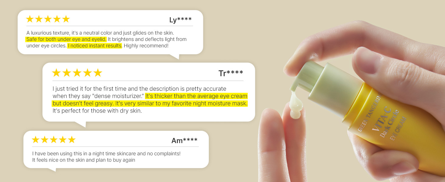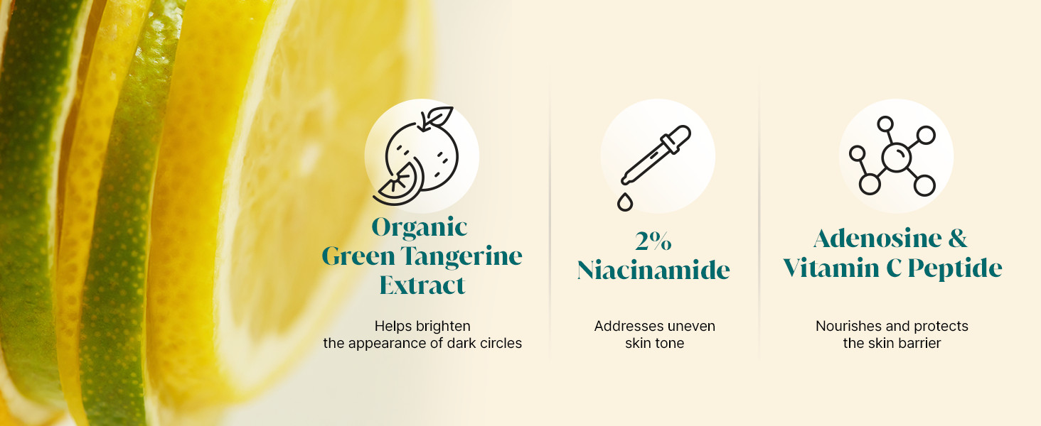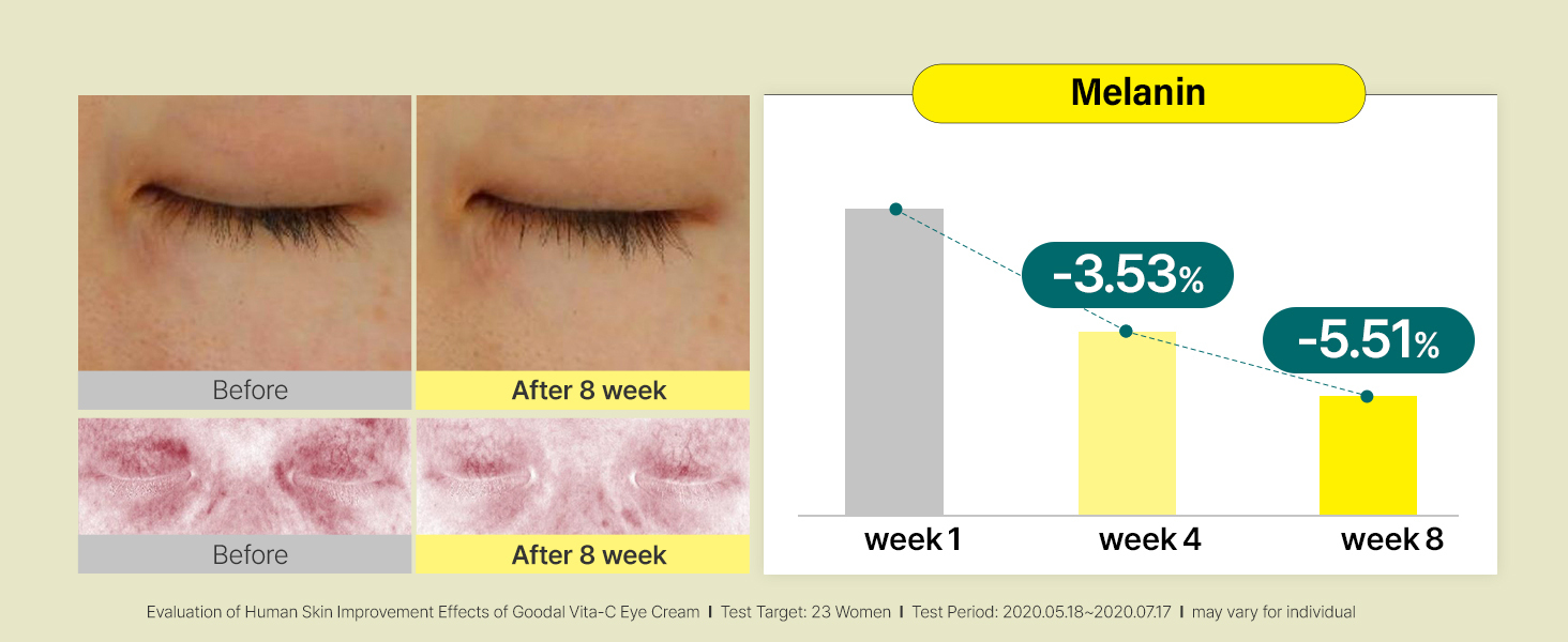 - [BYE BYE DARK CIRCLES IN 4 WEEKS] In a clinical study, 85.7% of subjects saw reduced dark circles starting at 4 weeks. Our combination of vitamin C, vitamin P, and green tangerine extract works together to clear up and brighten the skin around your eyes for noticeable results.
