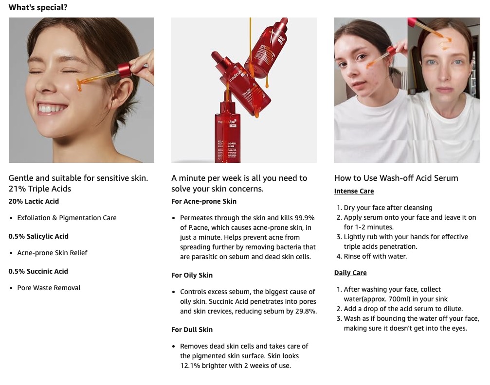 21% Red Succinic Acid Cleansing Booster Serum is made with highly concentrated acid. If your skin is sensitive to acids or not accustomed to highly concentrated acid products, perform a patch test on the forearm or behind your ear before using the product.