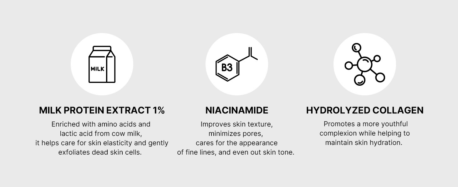 - Deep Hydration - Formulated with Niacinamide, Milk Protein Extract, and Hydrolyzed Collagen to deliver intense hydration, leaving your skin cushiony and supple.