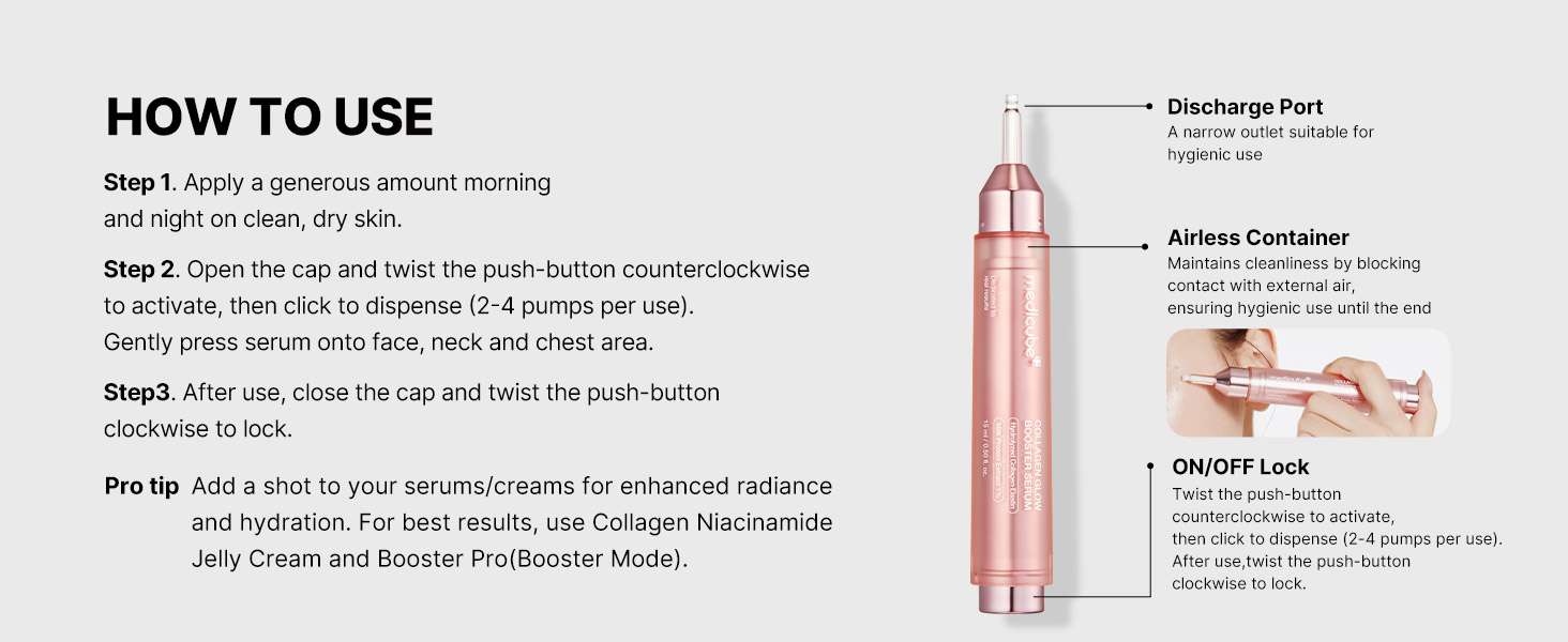 1. Open the serum by turning left and push the pump to apply a moderate amount to the face.