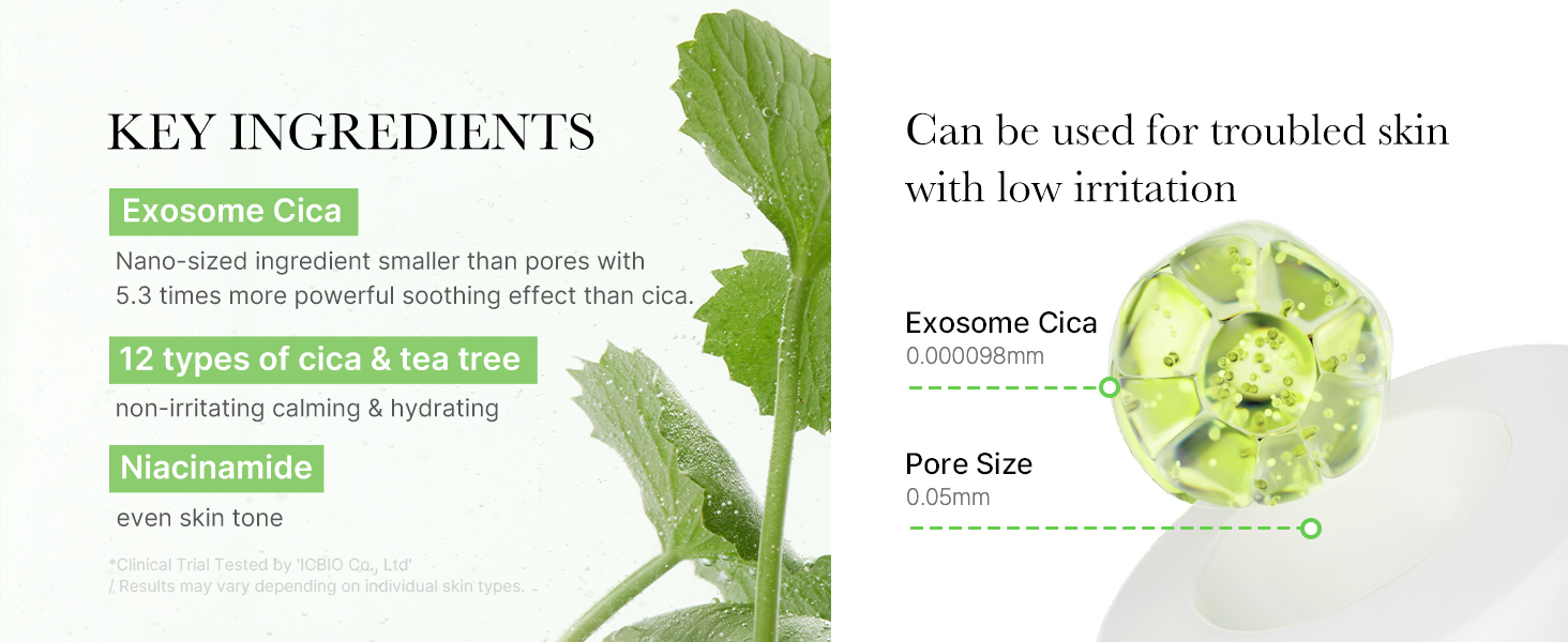 - ENRICHED WITH INNOVATIVE INGREDIENT : Contains exosome cica, Nano-sized ingredient smaller than pores with 5.3 times more powerful soothing effect than general cica. (*Clinical Trial Tested by 'ICBIO Co., Ltd' / Results may vary depending on individual skin types.)