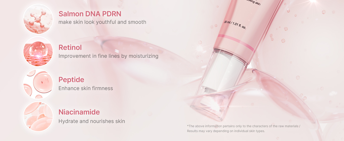 - Salmon DNA PDRN : Innovative ingredient that helps reduce the appearance of darkened areas and improves dull eye area. Highly concentrated Salmon DNA PDRN helps improve uneven skin tone and texture of eye area. *The above information pertains only to the characters of the raw materials