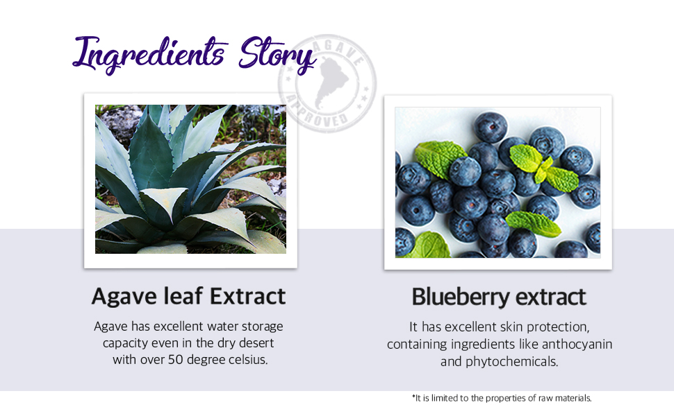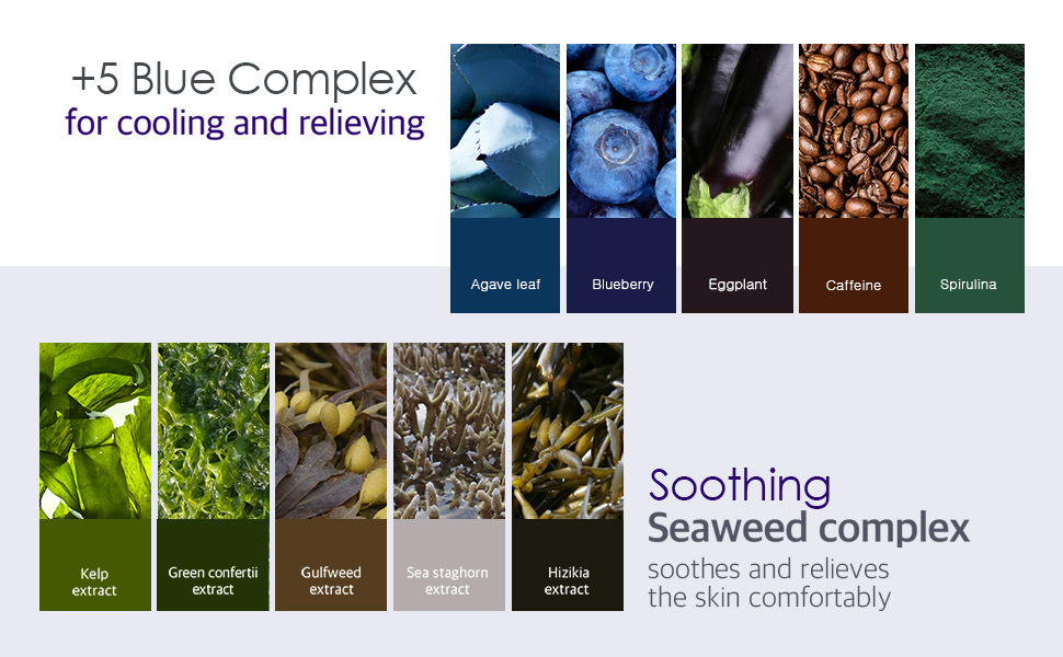 - 5 Blue Complex: A powerful blend of Agave Leaf, Blueberry, Eggplant, Caffeine, and Spirulina works to cool, soothe, and awaken tired skin.
