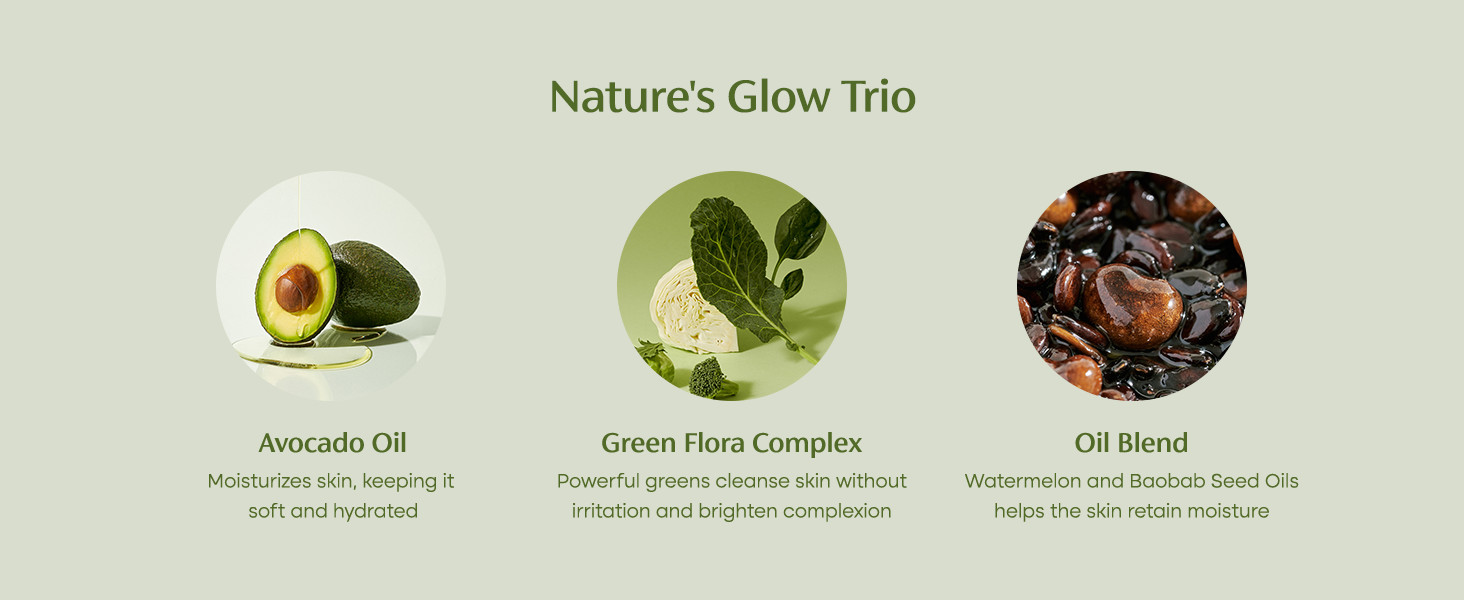 - A cleanser packed with powerful greens and rich Avocado Oil to melt away all impurities and refresh the skin.