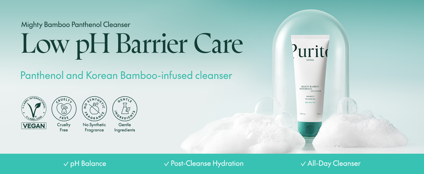PURITO’s Mighty Bamboo Panthenol Cleanser is a gentle, water-based facial cleanser designed to keep your skin’s barrier healthy while delivering a refreshing yet hydrating cleanse. With its low-pH formula, it works in harmony with your skin’s natural balance to minimise