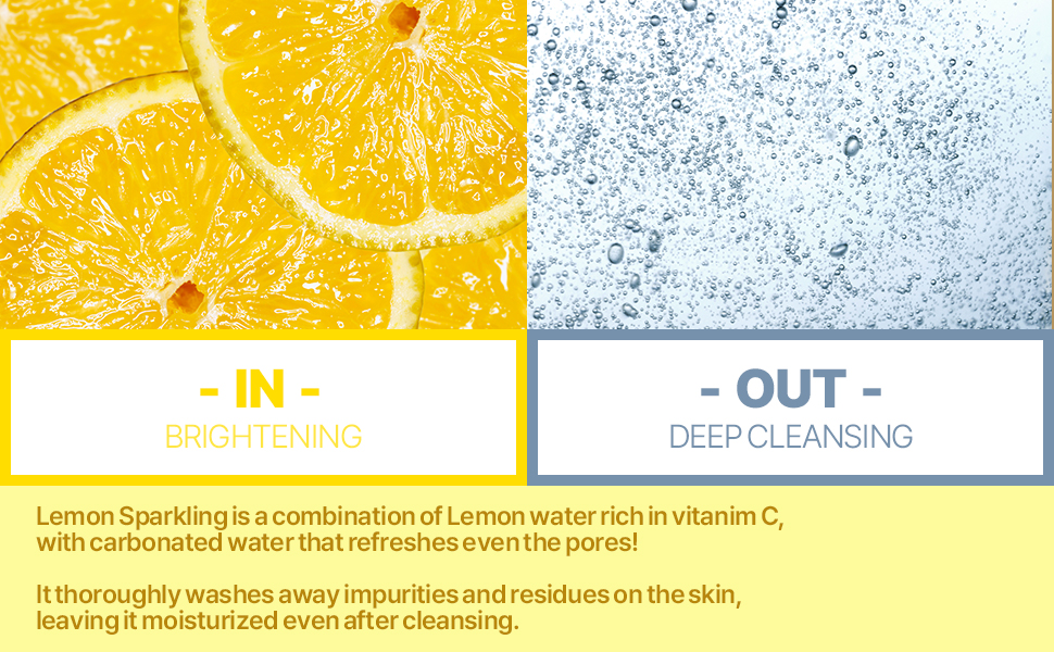 - Key Ingredients: Lemon Extract helps brighten the skin as it contains a plentiful amount of Vitamin C, and Sparkling Water thoroughly washes away impurities and helps maintain the skin barrier, keeping the skin moisturized even after cleansing.