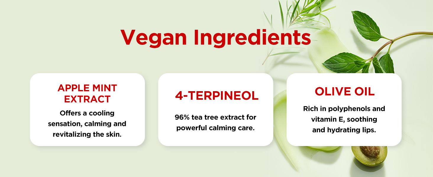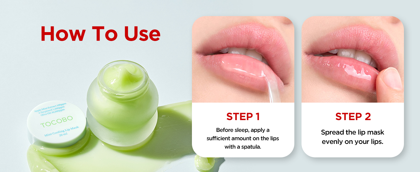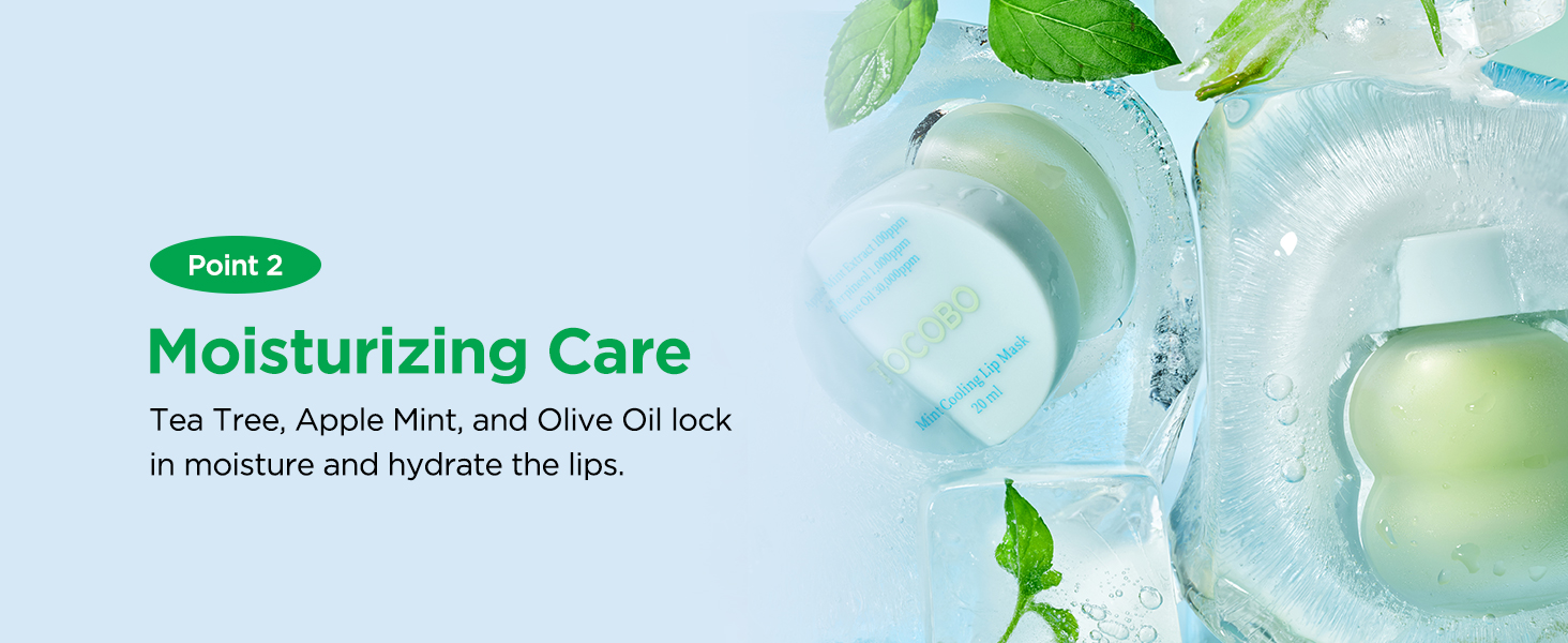 Apple mint and tea tree ingredients provide a cooling effect to soothe tired lips from all-day makeup, while high content of olive oil offers intense hydration and calms the lips in this cooling relief overnight lip mask