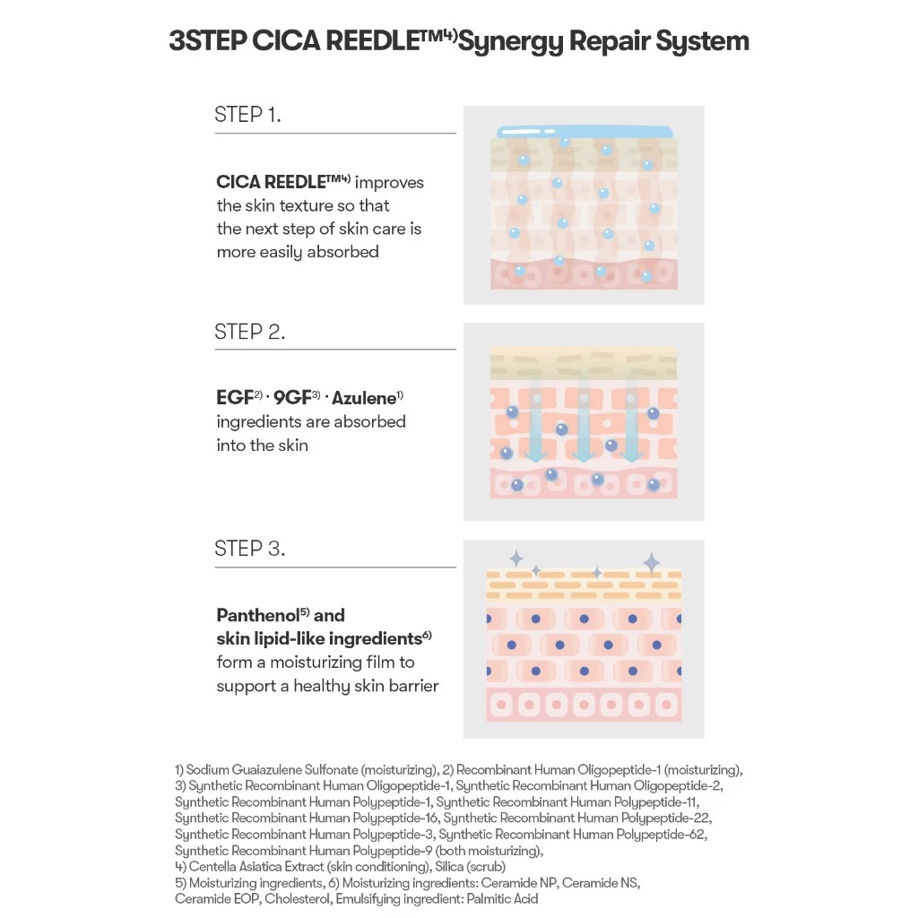 - 3-Step CICA REEDLE Synergy Repair System: Improves skin texture, enhances firmness, and delivers intensive care to address various skin barrier conditions.