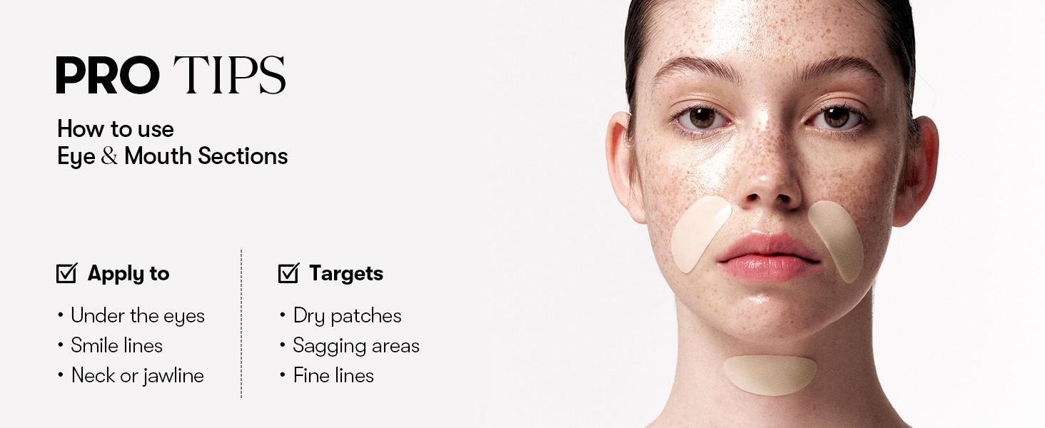 2. After Step 1 is fully absorbed, take out Step 2 hydrogel mask. Remove the backing films and place the lower half around the mouth and the upper half around the eyes.