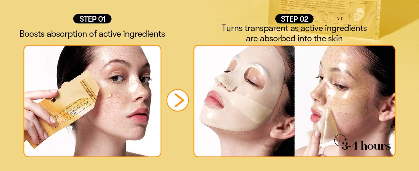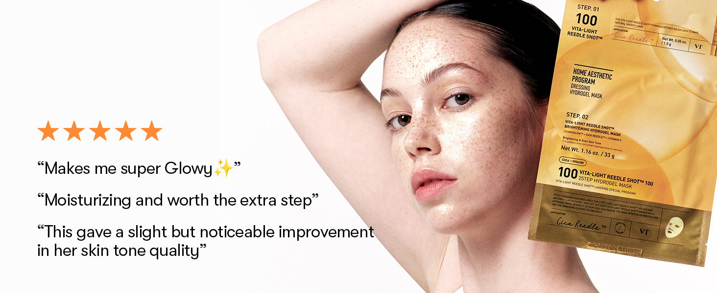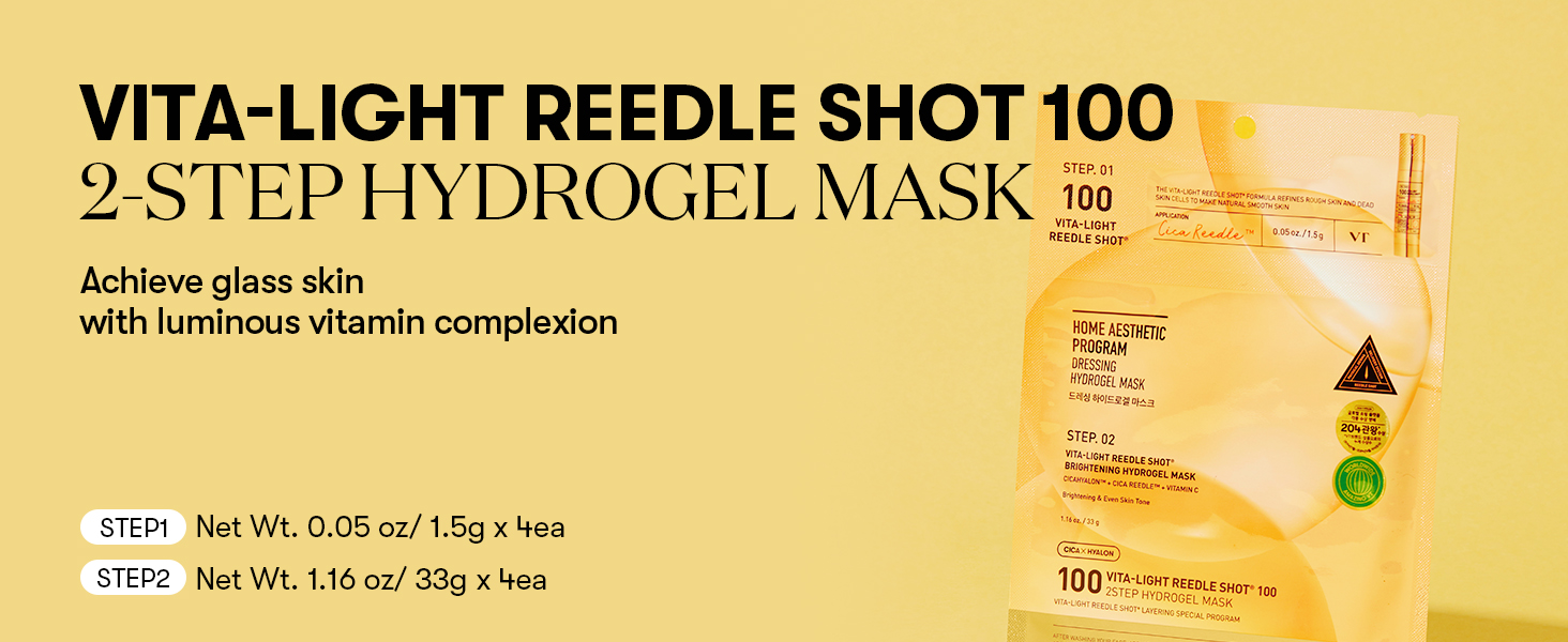 Revitalize your complexion with the VT Vita-Light Reedle Shot 2-Step Hydrogel Mask, designed for intensive brightening and rejuvenation.